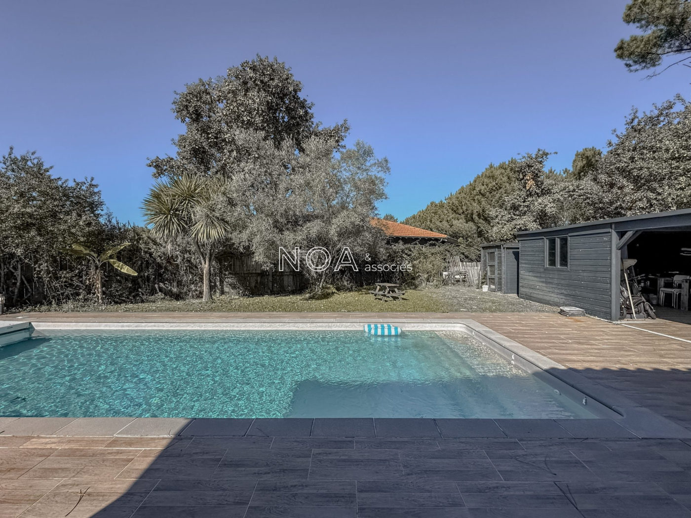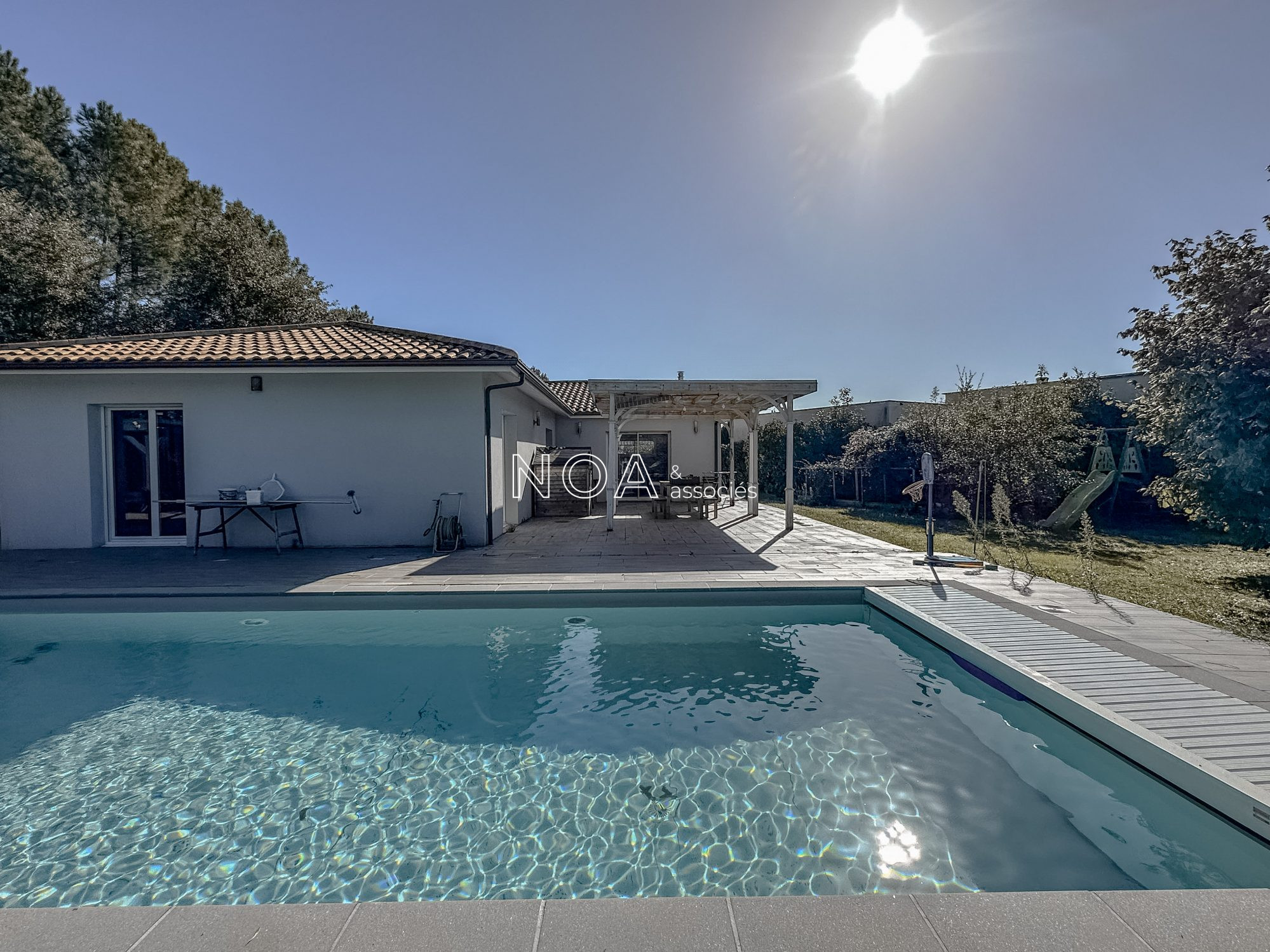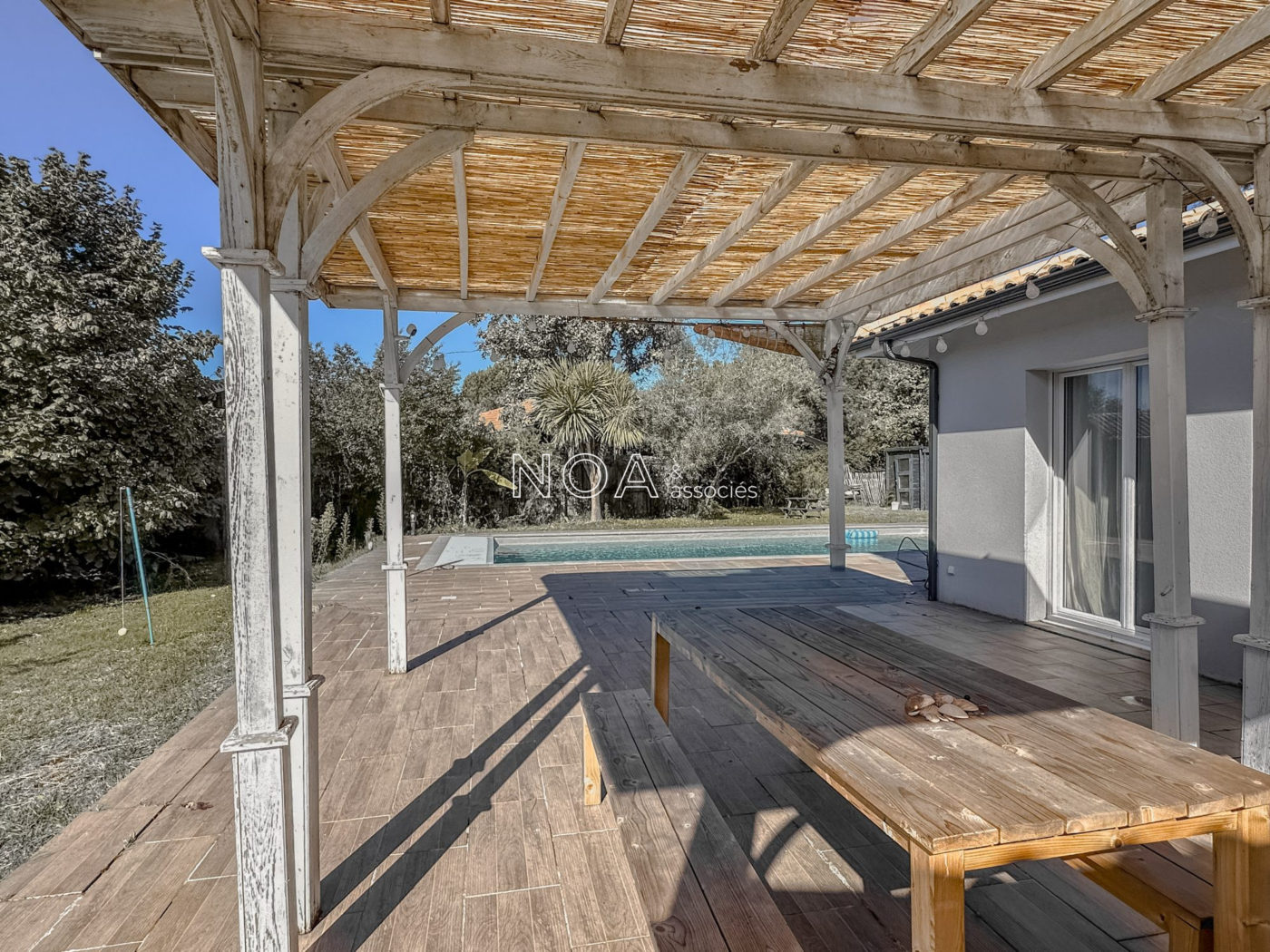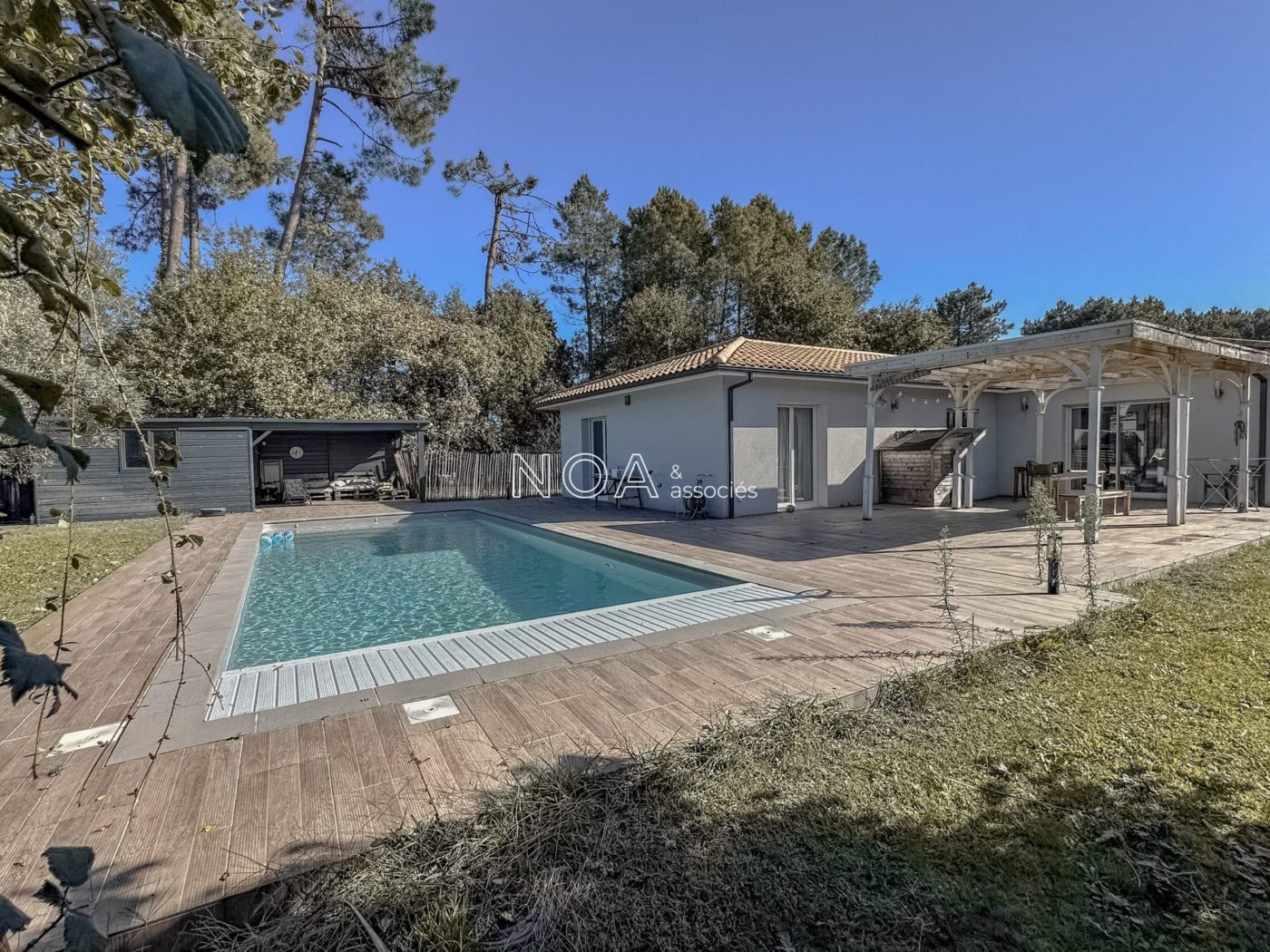 ARÈS - Venez découvrir cette vaste villa contemporaine située dans un quartier récent. Elle se compose d'une entrée avec placard, d'un salon séjour lumineux avec poêle à bois, une cuisine ouverte aménagée et équipée, un cellier-buanderie, 4 chambres dont 3 avec dressing donnant sur la piscine, une salle de bain avec douche et baignoire, et un WC indépendant. La maison est chaleureuse et offre des espaces agréables à vivre. Une dépendance s'ajoute au bien, vous proposant actuellement un aménagement de boutique avec comptoir et cabine d'essayage. Lieu idéal pour une profession libéral ou une activité annexe. À l'extérieur, vous profiterez d'un jardin de plus de 1500m2 sans aucun vis-à-vis avec vue sur la forêt, une piscine chauffée avec son pool house et une terrasse avec pergola pour de bons moments conviviaux en journée ou en soirée. L'étendue du jardin vous permettra de profiter de diverses coins de détente intimistes. Deux cabanons, un poulailler et une allée goudronnée viennent compléter les atouts certains de ce bien dont les qualités sont à découvrir.