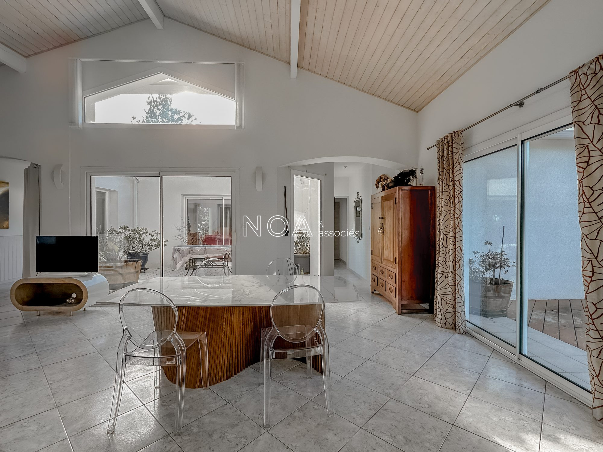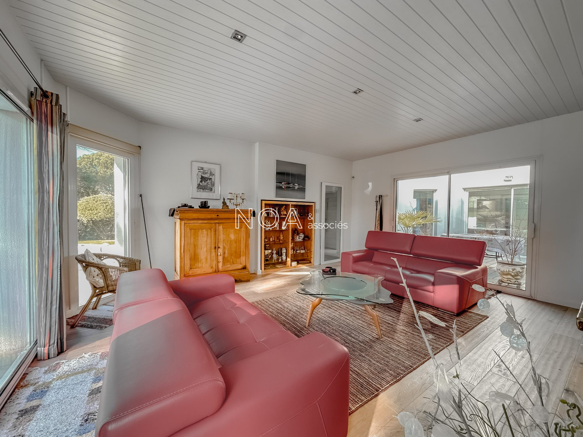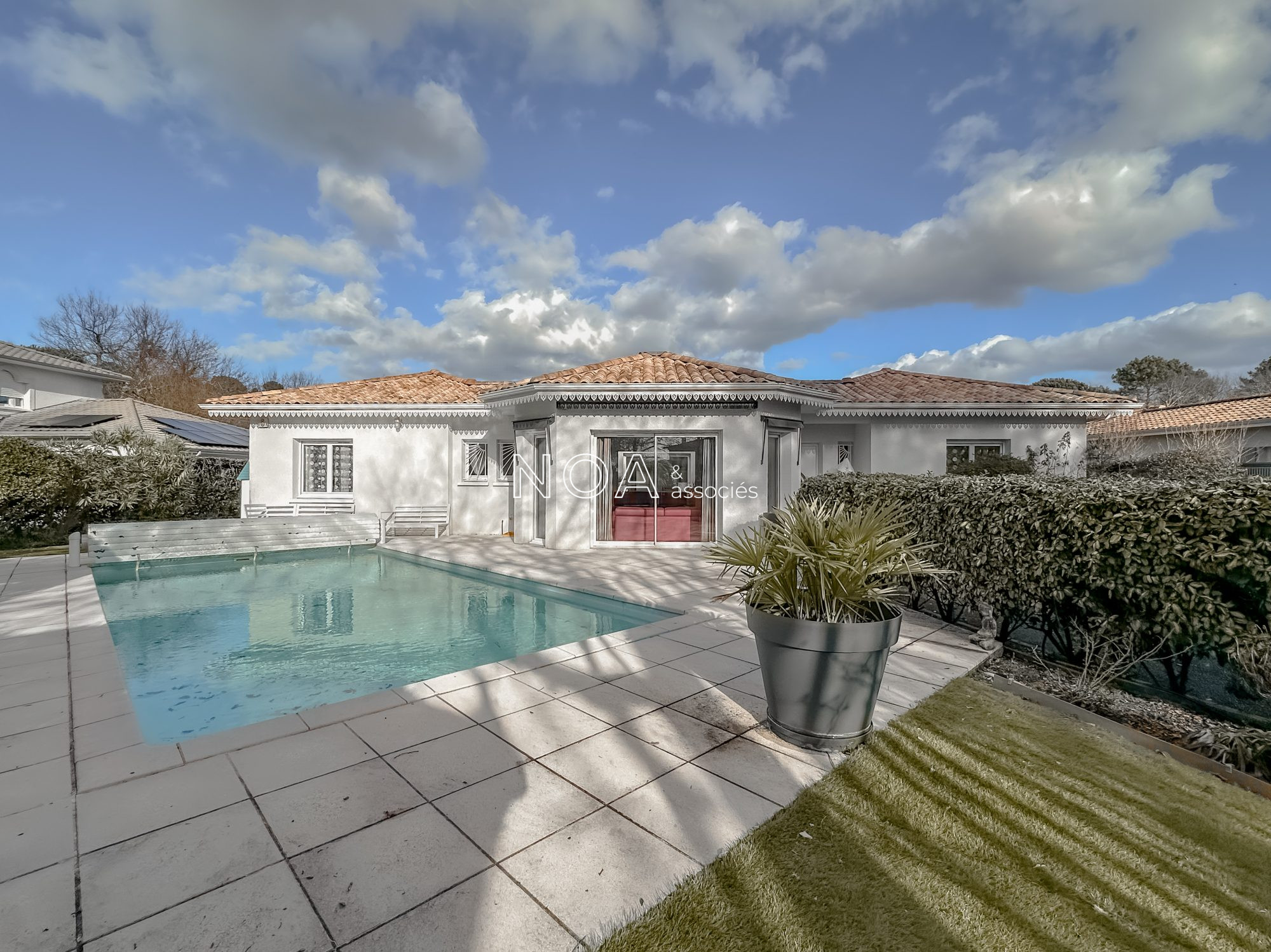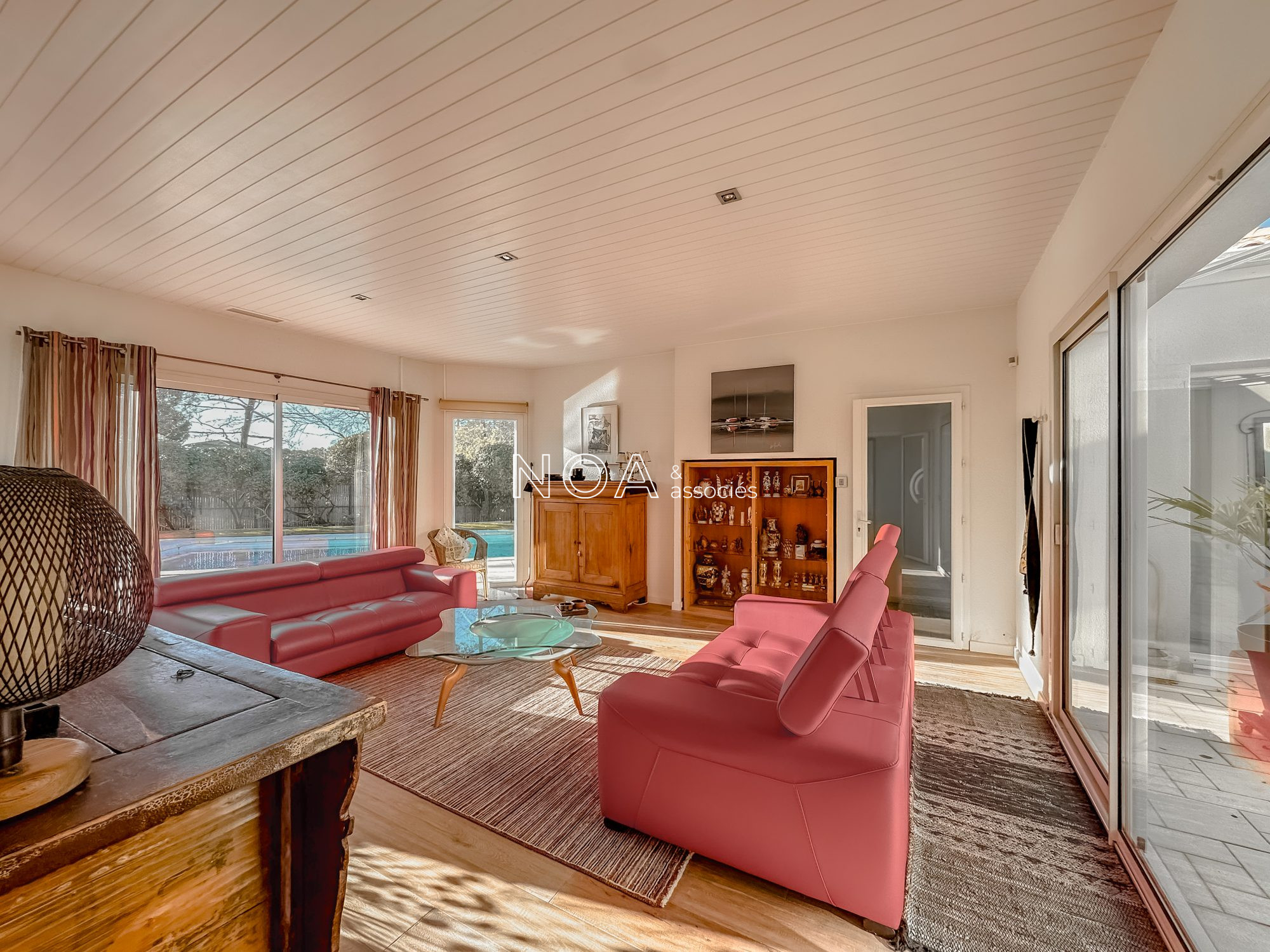 ANDERNOS LES BAINS - Dans un cadre préservé et boisé, cette villa déploie ses 193 m² habitables sur un terrain de 986 m². De plain pied, elle offre un art de vivre atypique, où confort rime avec intimité : 2 coins nuits indépendants de part et d'autre de la maison, 2 espaces de vie et des communications simples entre ces pièces. La maison propose une entrée avec placard, 2 salons séjours, une cuisine indépendante pouvant s'ouvrir sur le salon avec sa porte coulissante, 5 chambres, une salle de bain, une salle d'eau, 2 WC indépendants, un dressing et un vaste cellier / buanderie. Les espaces de vie baignés de lumière s’ouvrent sur un patio central, rajoutant un espace convivial supplémentaire durant les beaux jours. Le jardin dispose d’une jolie piscine et sa terrasse, avec une vue dégagée dans un environnement des plus paisible et arboré. S'ajoute à cela un abri de jardin ainsi qu'une seconde terrasse. Le stationnement est aisé grâce à une allée goudronnée permettant plusieurs places disponibles ainsi qu'un vaste garage de plus de 20 m2. Un lieu de vie harmonieux, fonctionnelle et étendu.
