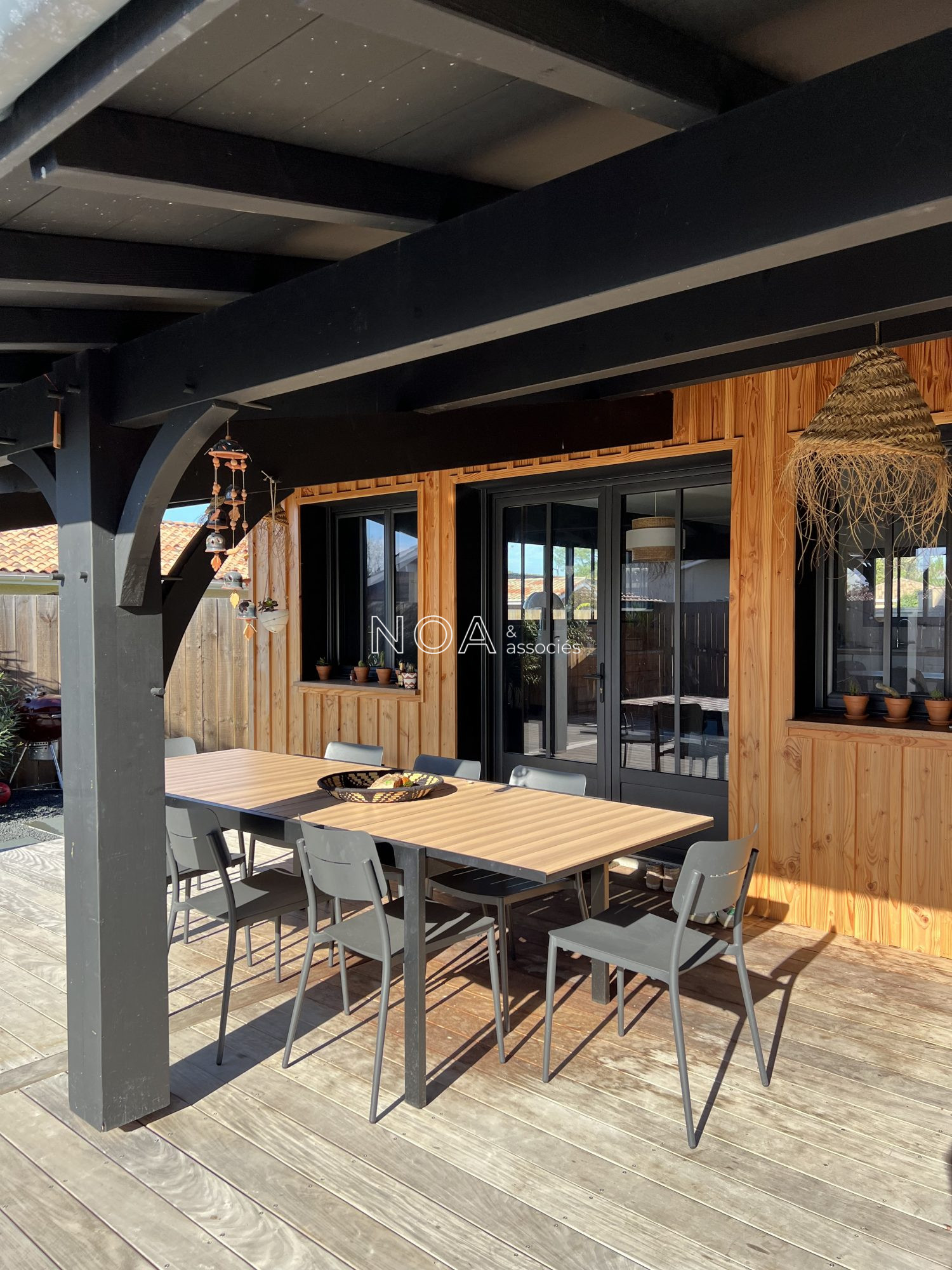 ARES - Située dans un environnement calme, à proximité des plages et de l'ambiance des villages ostréicoles du bord du bassin d'Arcachon, cette magnifique villa contemporaine bois, avec piscine chauffée, vous accueille pour vos vacances en famille ou entre amis. Vous apprécierez ses espaces ainsi que ses nombreuses ouvertures sur l'extérieur. La maison offre une belle pièce de vie avec salon séjour et cuisine ouverte, plongeant sur une vue de la terrasse ombragée et la piscine. Puis vous trouverez un vaste cellier buanderie, une suite parentale avec dressing et salle d'eau, une seconde chambre, un WC indépendant et une entrée. L'étage dessert 3 chambres, une salle d'eau et un second WC indépendant. Profitez de ce doux rythme de vie au bord de la piscine et de sa terrasse bois, des plages océaniques et du pourtour du bassin pour vous ressourcez l'espace d'un temps dans un univers unique. Commerces à 5 min à vélo, bord du bassin d'Arcachon à 1,8 kms et plages océaniques à 12 kms. Le Cap Ferret est à 22 kms. L'aéroport de Bordeaux Mérignac est à 35 min, la gare St Jean et Bordeaux centre à 50 min. n